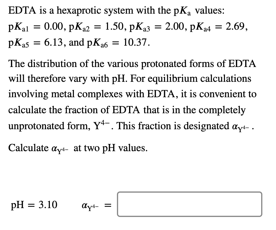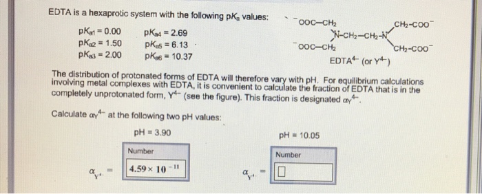 The distribution of protonated forms of. Ad Product selection guide for all protein analysis needs. PKa1 000 pKa4 269 pKa2 150 pKa5 613 pKa3 200 pKa6 1037 The distribution of protonated forms of EDTA will therefore vary with pH. Learning centers handbooks protocols scientific posters citations get support. We substitute the values off after the reaction in tow. Cas 2H2Og S. Show transcribed image text EDTA is a hex aprotic system with the following pKa values.